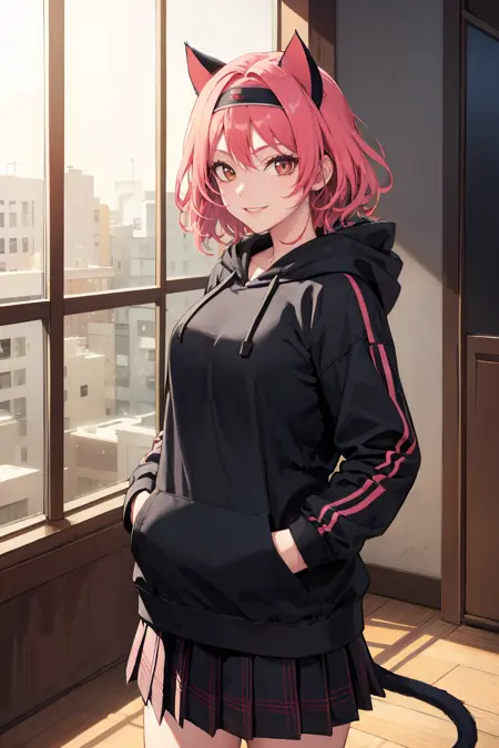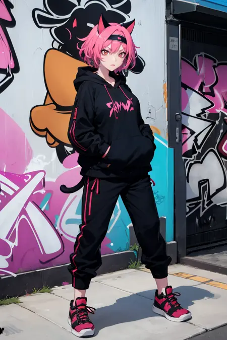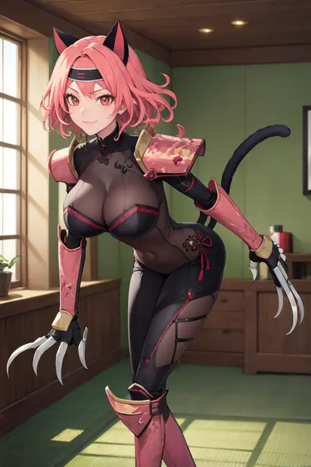 YuukiNinjaWars, cat ears, tail, short hair, hairband, bodysuit, shoulder armor, gauntlets, claws, knee boots