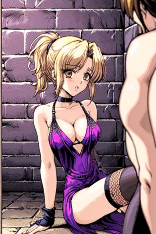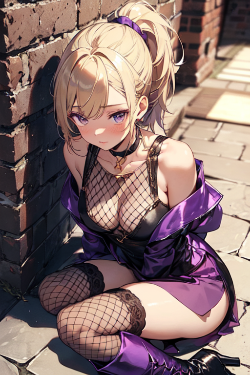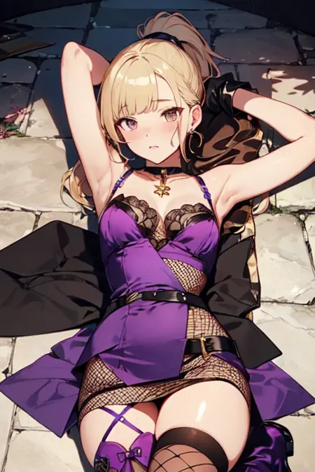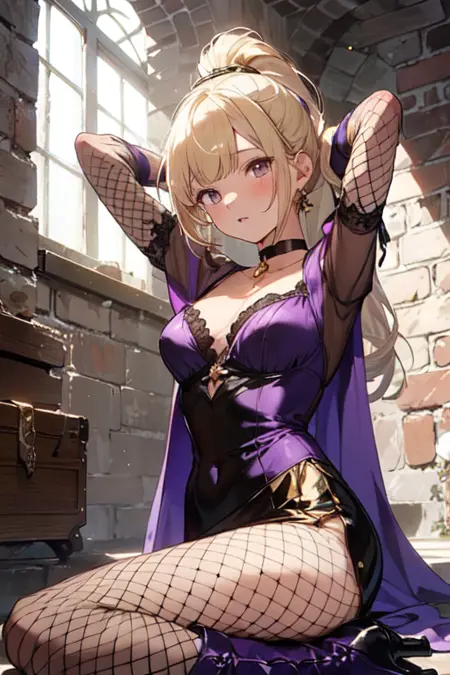 purple silk slit dress, mini skirt, purple silk choker necklace, cleavage, black fishnet inner, purple long boots, fishnet knee socks,