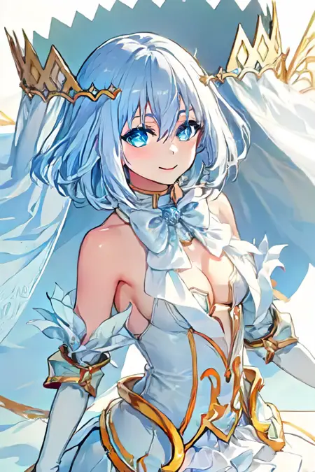 1girl, bangs, bare shoulders, blue eyes, breasts, center opening cleavage, crown, detached sleeves, elbow gloves, hair between eyes, looking at viewer, medium breasts, portrait, short hair, simple background, sky, small breasts, smile, solo, white bow, white bowtie, white dress, white footwear, white gloves, white hair, white thighhighs, white veil