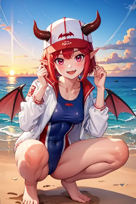 Tags: yuzelg, competition swimsuit, white open jacket, demon wings, demon horns, baseball cap