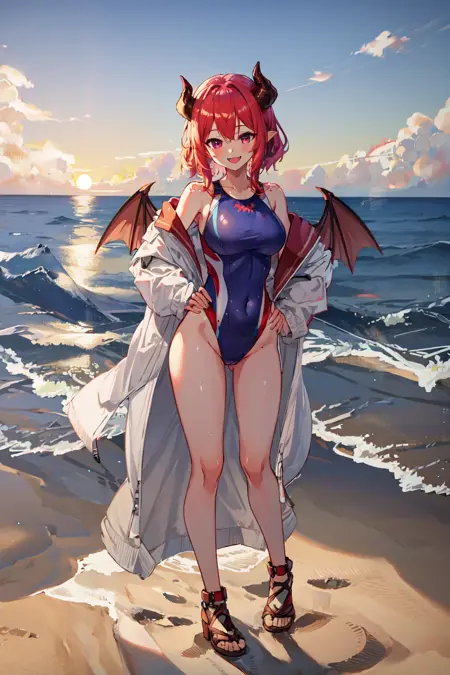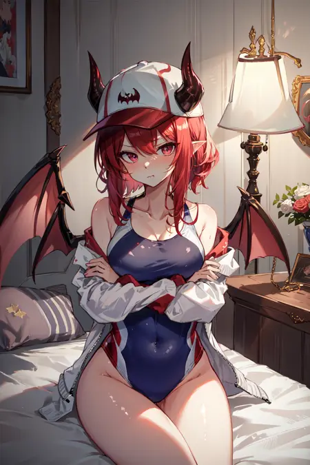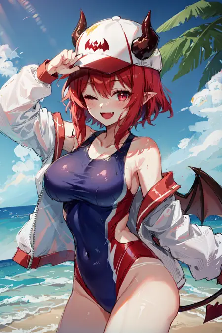 Tags: yuzelg, competition swimsuit, white open jacket, demon wings, demon horns, baseball cap