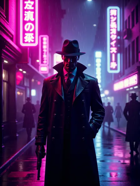 for this LoRA I tried to combine the dark noir style with a cyberpunk neon look.