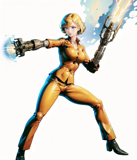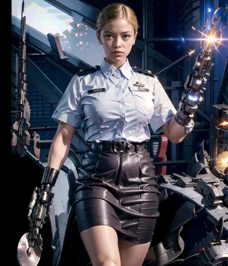 おそらく、「t-x」「terminator 3」「blonde hair」「single mechanical arm」「comb over」「forehead」「parted bangs」「slick side-parted bun」などのプロンプト(トリガー語)を使って、T-Xが人間として偽装した基本的な姿を生成できます。さらに、「bullet hole」「damaged」「mechanical parts」「robotic reveal」を追加すれば、人間の姿から銃弾の衝撃で内部構造が一部露わになった姿も生成可能です。そして、T-Xの服を以下のように変更して生成できます: