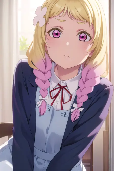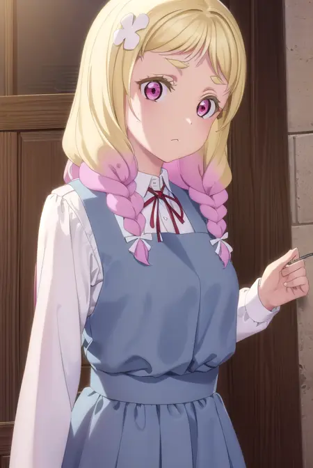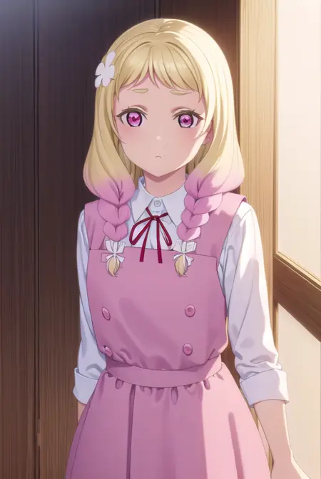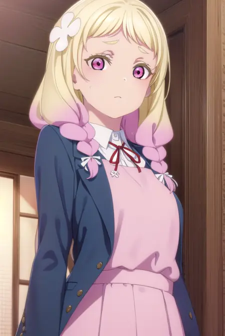 natsumi onitsuka, 긴 머리, 금발, 머리 장식, 분홍색 머리, 땋은 머리, 꽃, 다색 머리, 머리 꽃, (분홍색 눈:1.3), 쌍 땋은 머리, 그라데이션 머리,