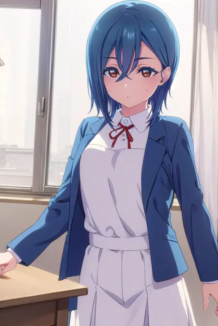 셔츠, 드레스, 리본, 학교 유니폼, 재킷, 흰 셔츠, 벌어진 옷, 칼라 셔츠, 벌어진 재킷, 빨간 리본, 목 리본, 파란 재킷, 앞치마 드레스, 회색 드레스, yuigaoka 학교 유니폼,