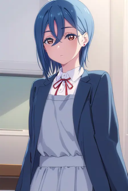 shiki wakana, 단발, 앞머리, (빨간 눈:1.3), 눈 사이의 머리카락, 파란 머리, 귀걸이, 스터드 귀걸이,