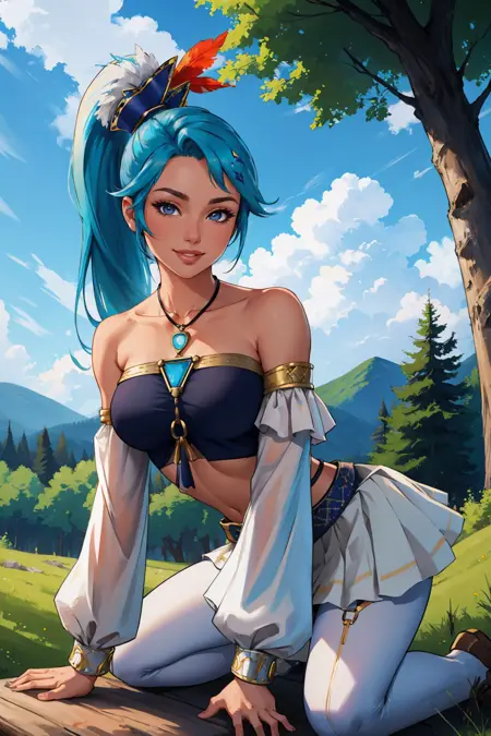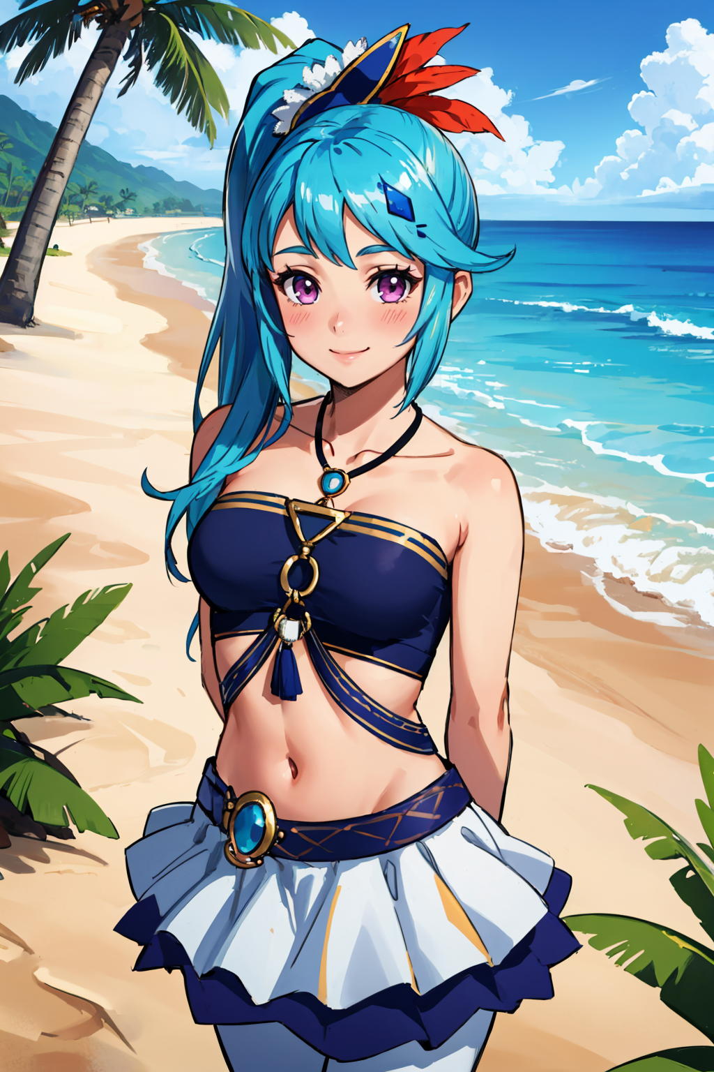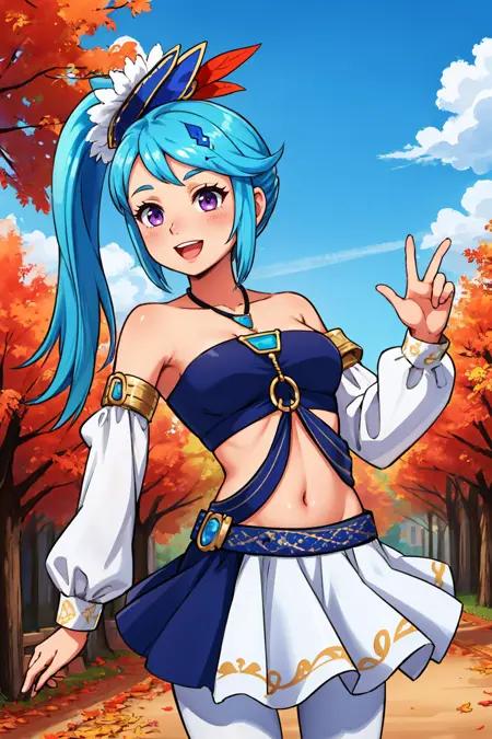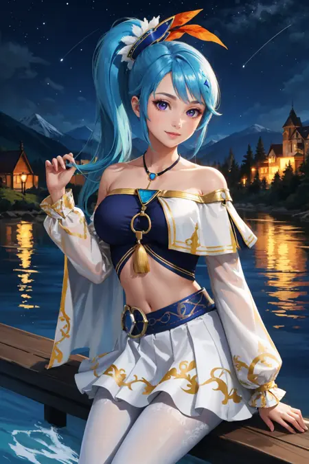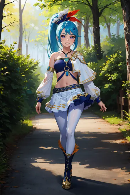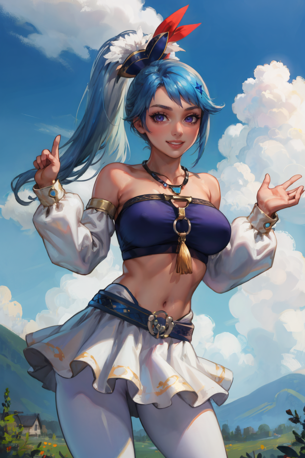 Add "hair ornament, necklace, white capelet, detached sleeves, bare shoulder, blue crop top, midriff, harness, belt, white skirt" for her typical look.