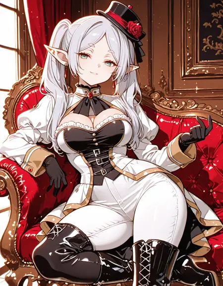 Invoke at 0.8, r1d3r, (formal jacket), long sleeves, (tailcoat), white pants, ascot, frills, high collar, high heel boots, cuffs, buttons, flower, puffy sleeves, fascinator