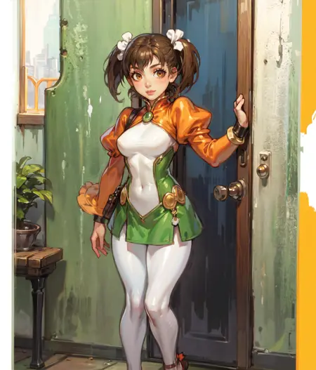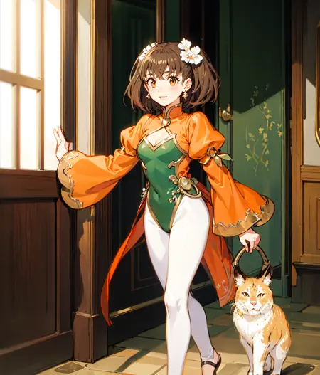 显著标签:棕发、短发、棕眼、灰色紧身衣、橙色袖子、绿色裙子、白色裤袜、凉鞋、腕带