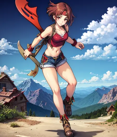 Notable tags: short hair, brown hair, red top, shorts, wristband, headband, feather, wristbands,