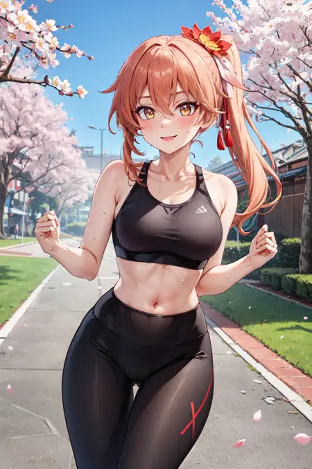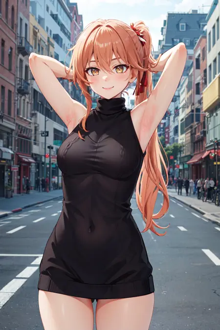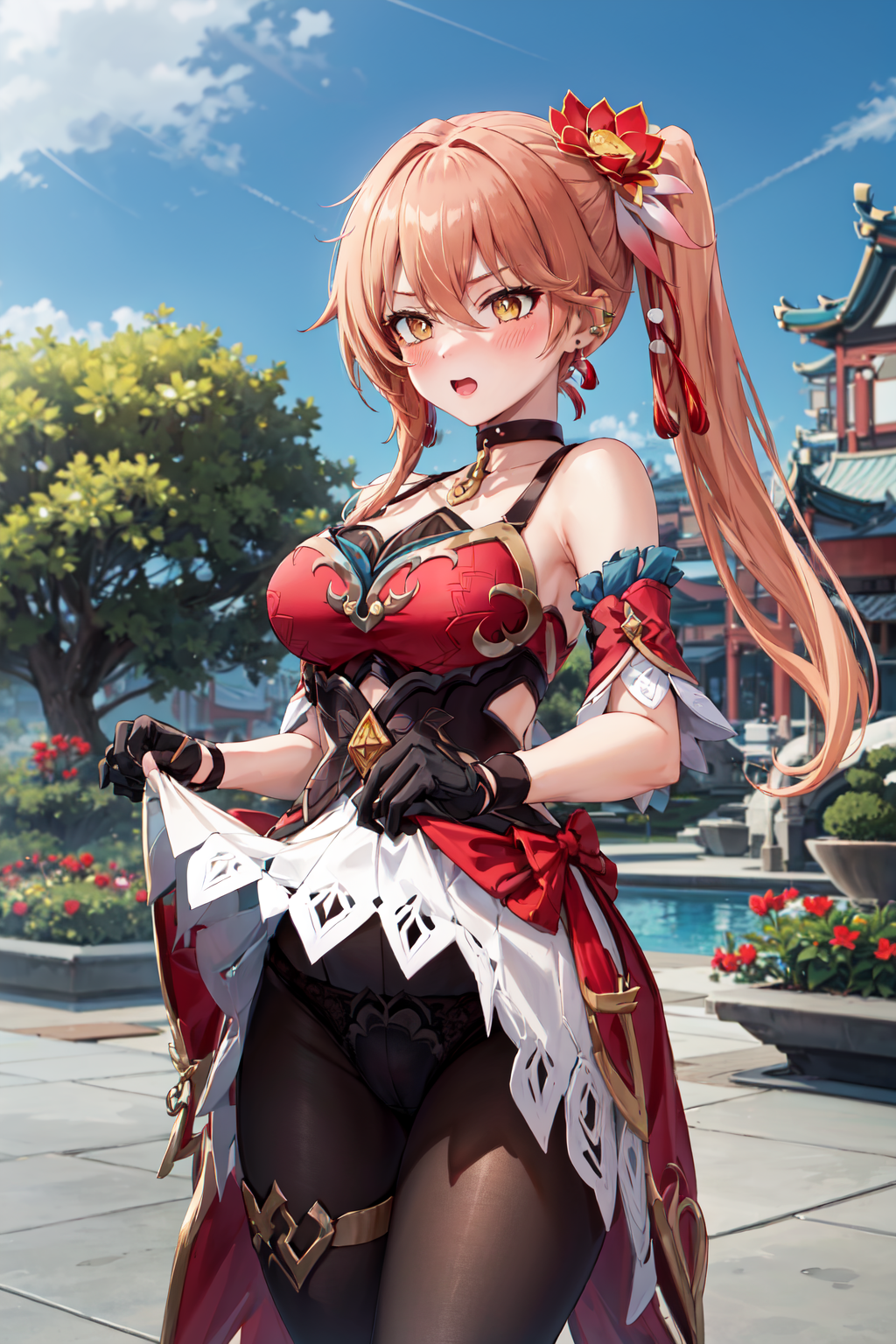 - guinaifen,long hair,side ponytail,bangs,hair between eyes,earrings,black choker,hair flower,chinese clothes,bare shoulders,dress,red dress,sleeveless,detached sleeves,fingerless gloves,white skirt,black pantyhose,thigh strap,boots,high heels,black footwear