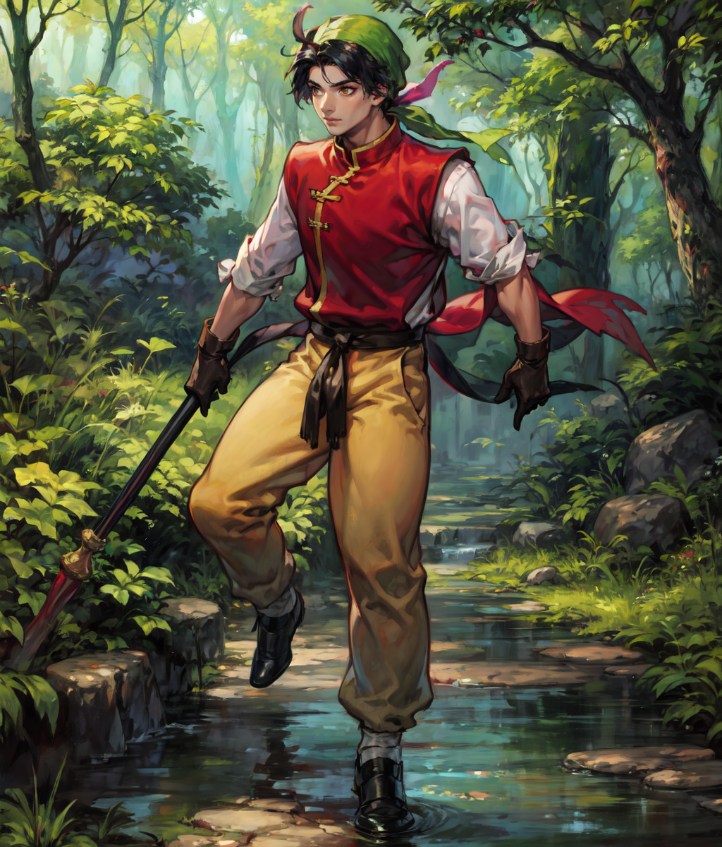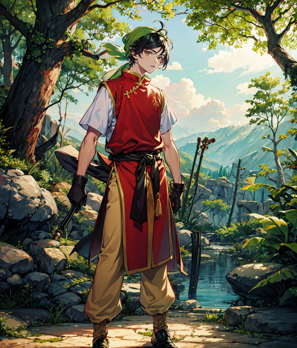Notable tags: black hair, bandana, chinese clothes, red shirt, white sleeves, yellow pants,