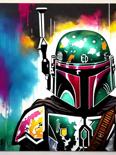 - graffiti art style. boba fett. bounty hunter. the mandalorian. Epic cinematic shootout::2 Fanart.. Amazing colours. Water colours. Imperial colours, Acrylic crayons. Clear. Focused. Cinematic post processing. Award winning cinematography.