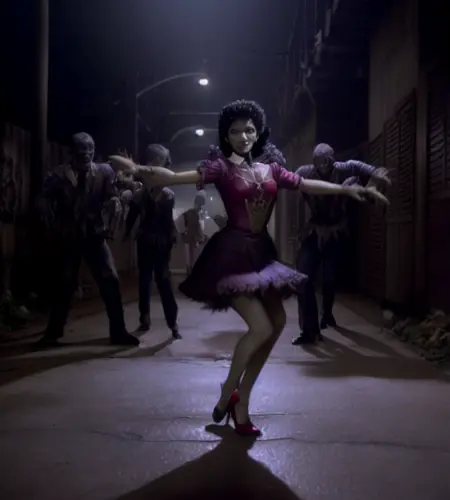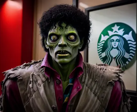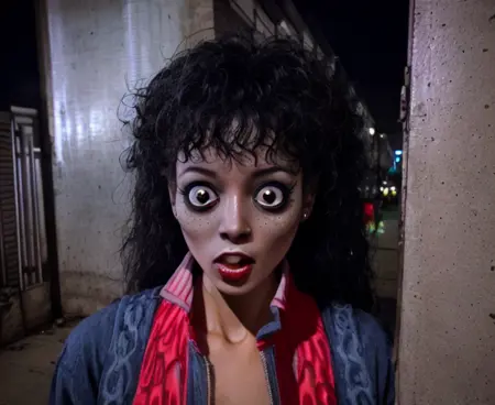 このLoRAはマイケル・ジャクソンの『スリラー』ミュージックビデオから数百枚の高品質な静止画をもとにスタイル学習されています。クローズアップポートレートに最適です。他の用途にも使えますが、効果は異なります。あなたがほとんど努力しなくても、可愛い(?)ゾンビを生成できます。実例の画像をご覧ください。