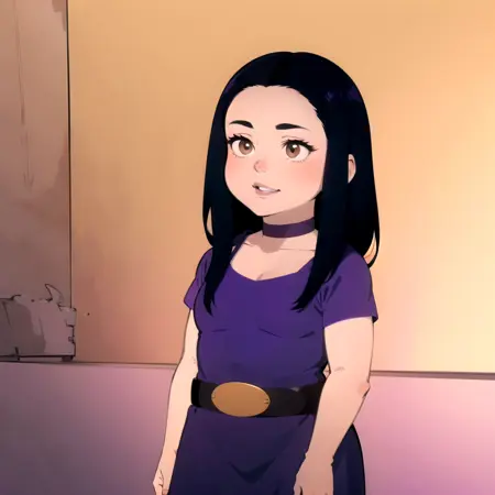 solo, 1girl, belt, black hair, brown eyes, choker, debbie hyman, dress, long hair, makeup, purple dress, short sleeves,