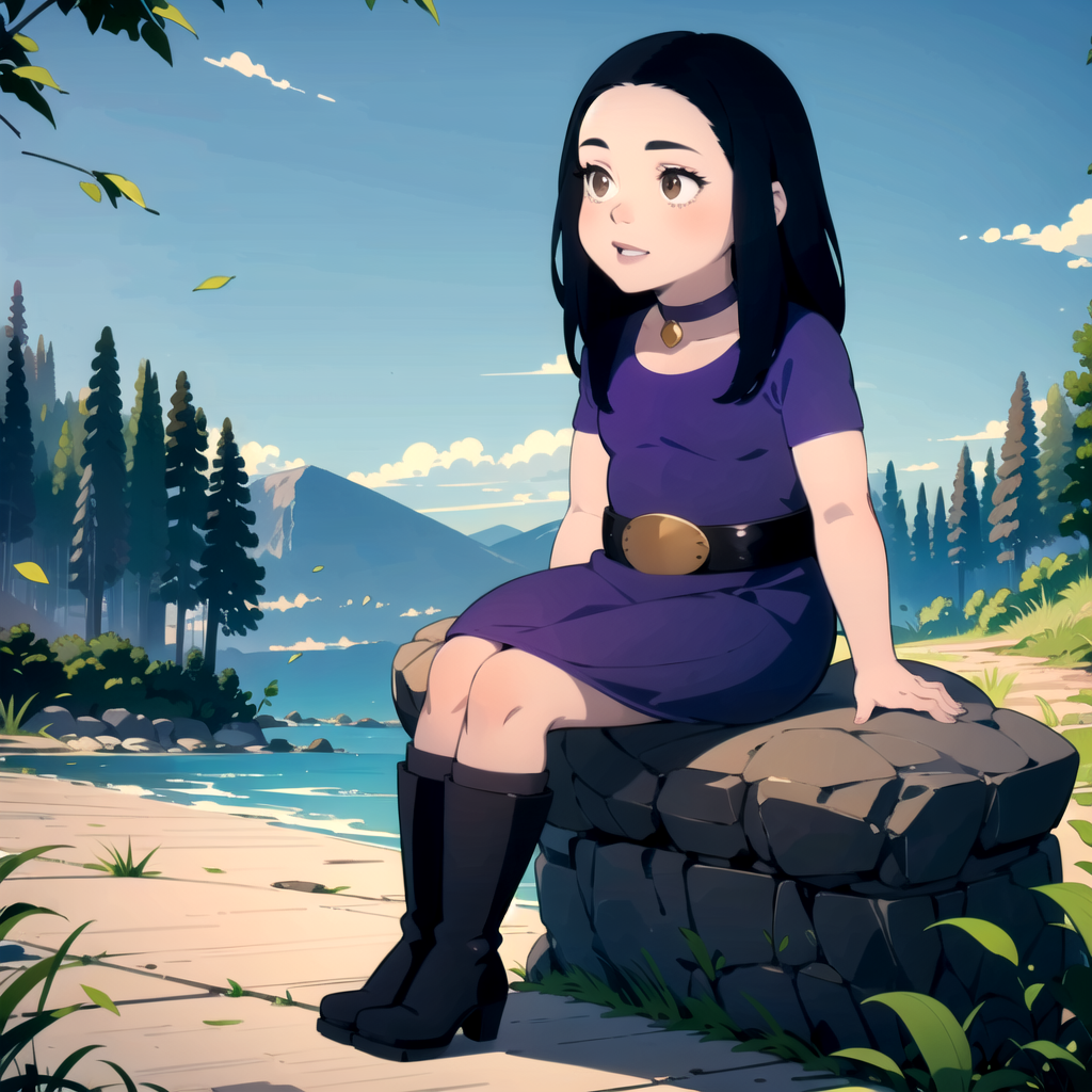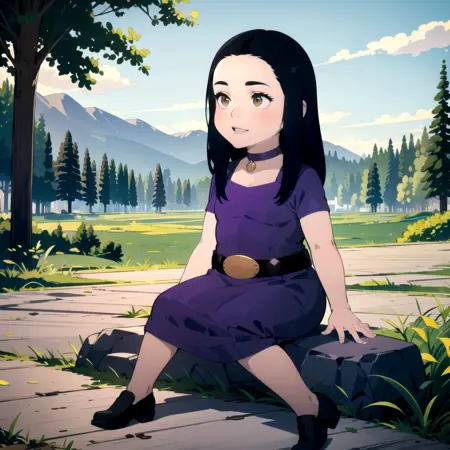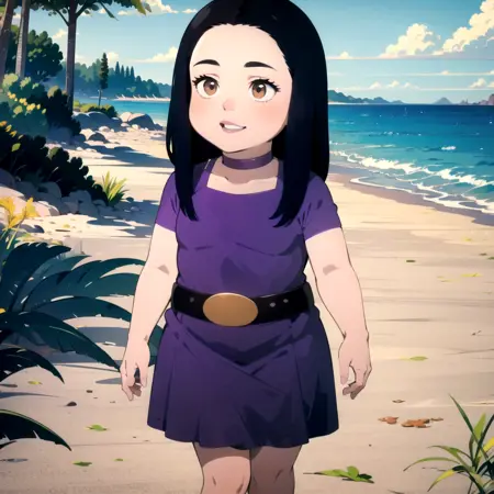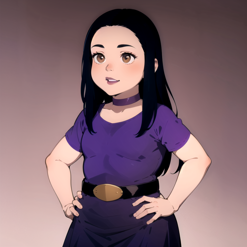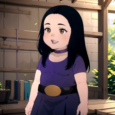 solo, 1girl, child, belt, black hair, brown eyes, choker, debbie hyman, dress, long hair, makeup, purple dress, short sleeves, black boots,