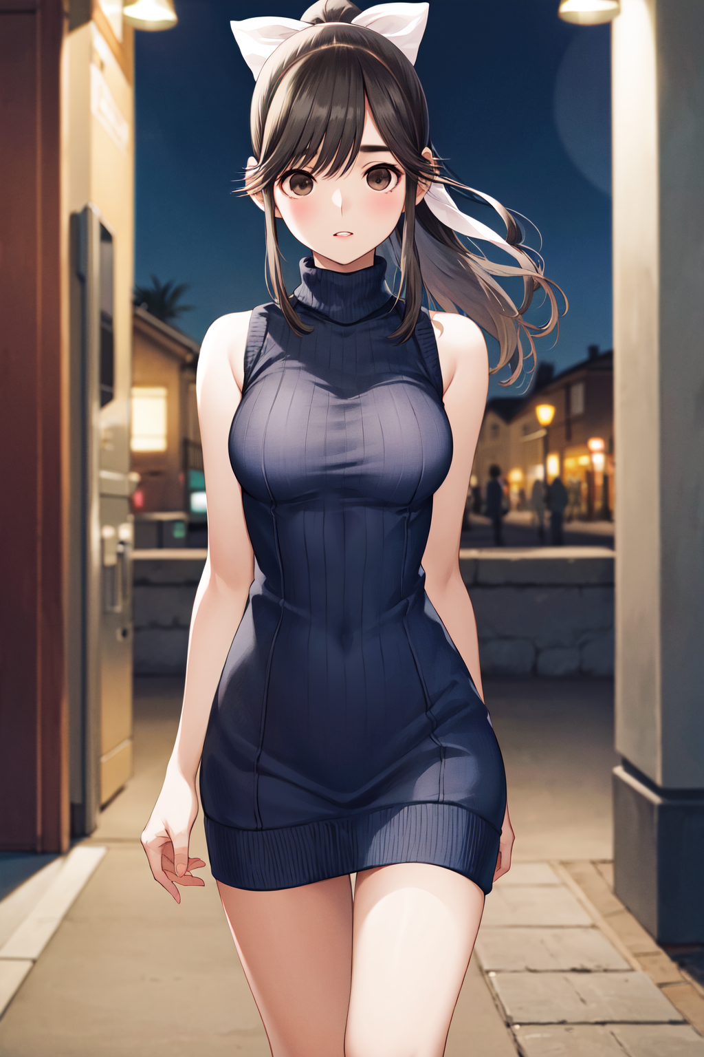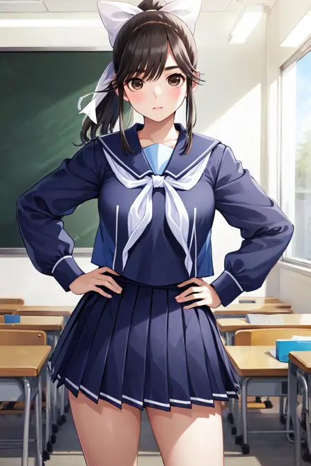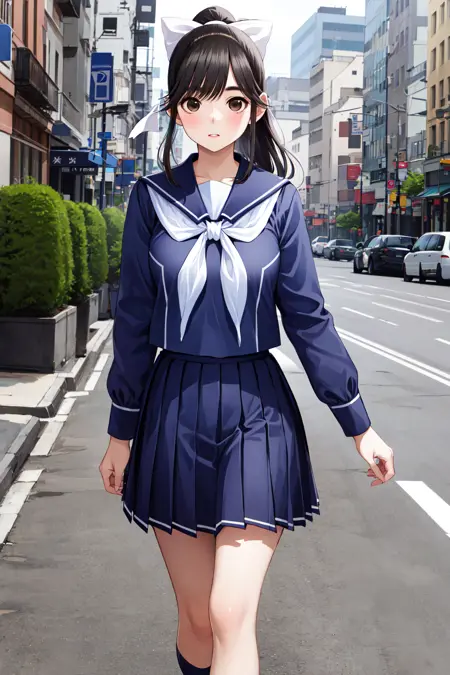 衣装1aamanaka, long hair, ponytail, hair bow, blue serafuku, blue shirt, long sleeves, blue sailor collar, white neckerchief, pleated skirt, blue skirt