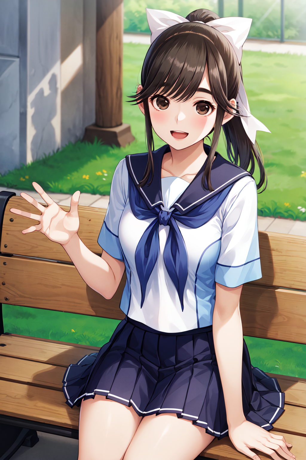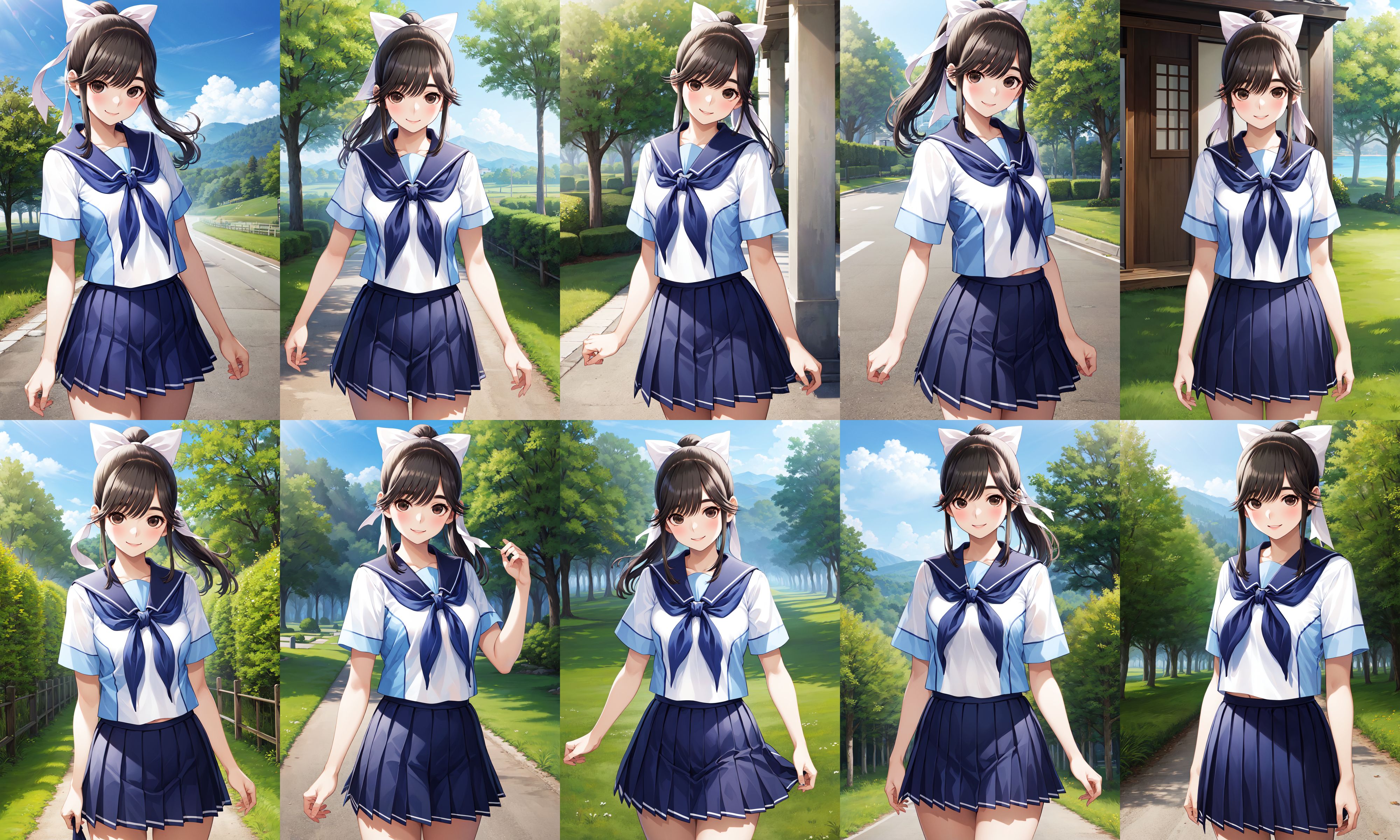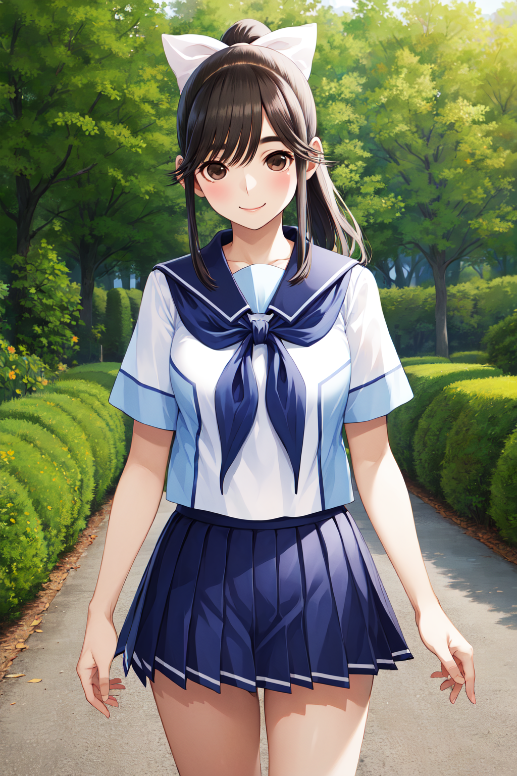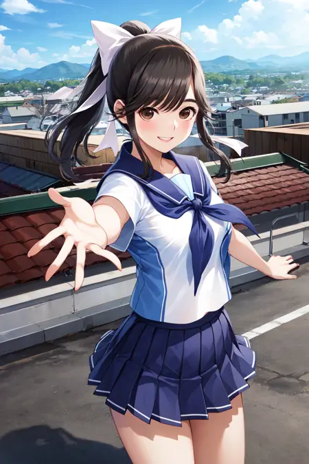 衣装1aamanaka, long hair, ponytail, hair bow, serafuku, white shirt, short sleeves, sailor collar, blue neckerchief, pleated skirt, blue skirt