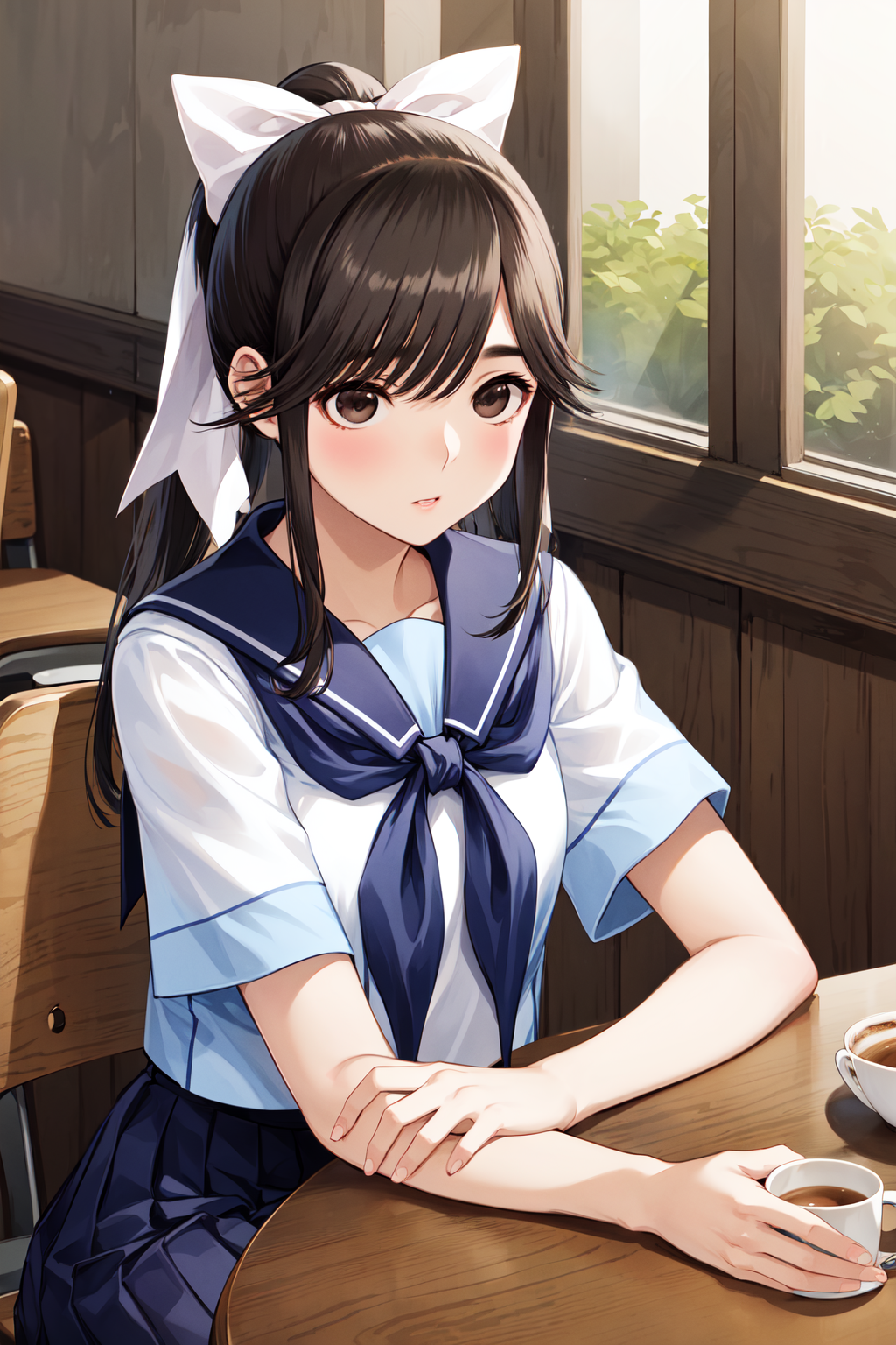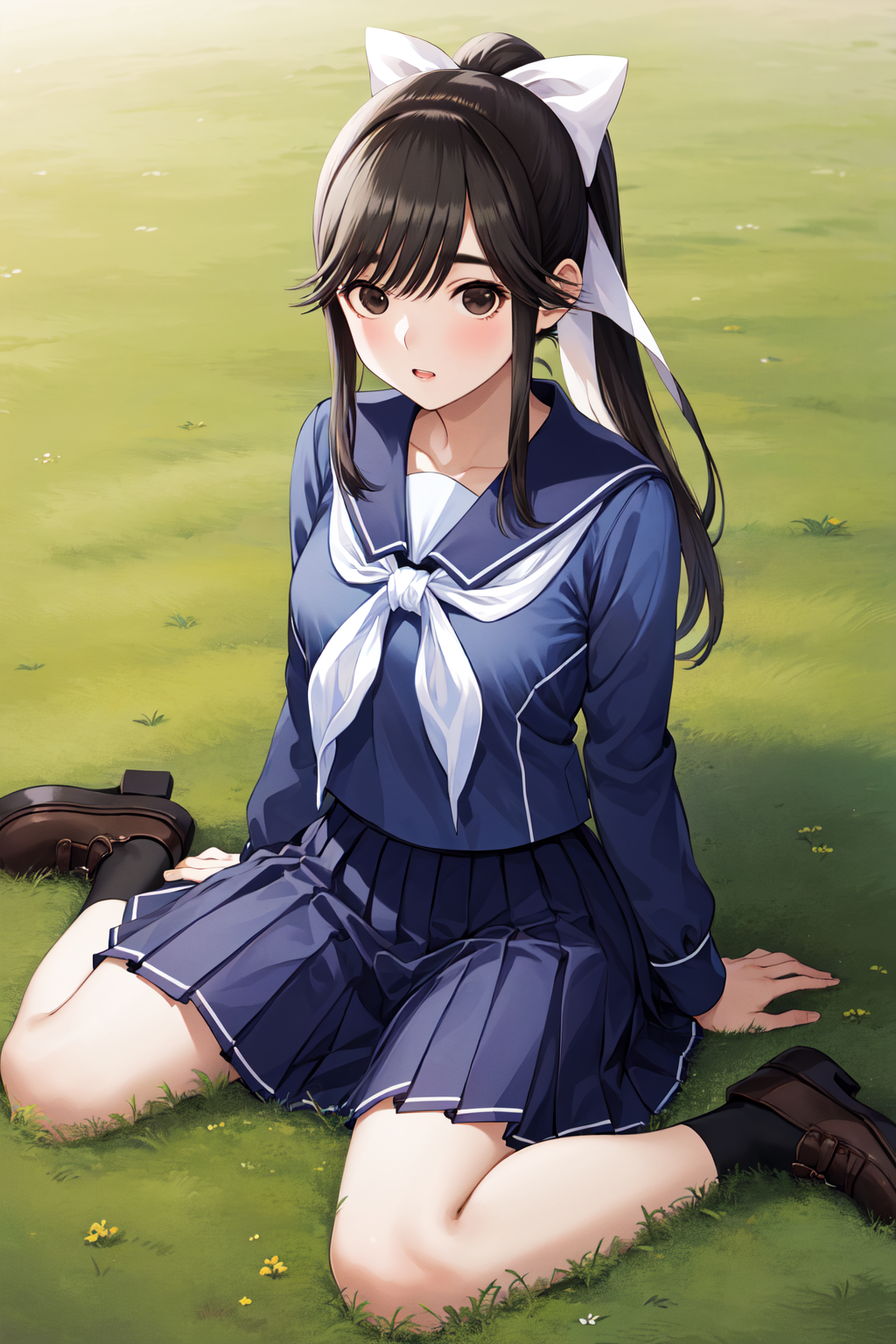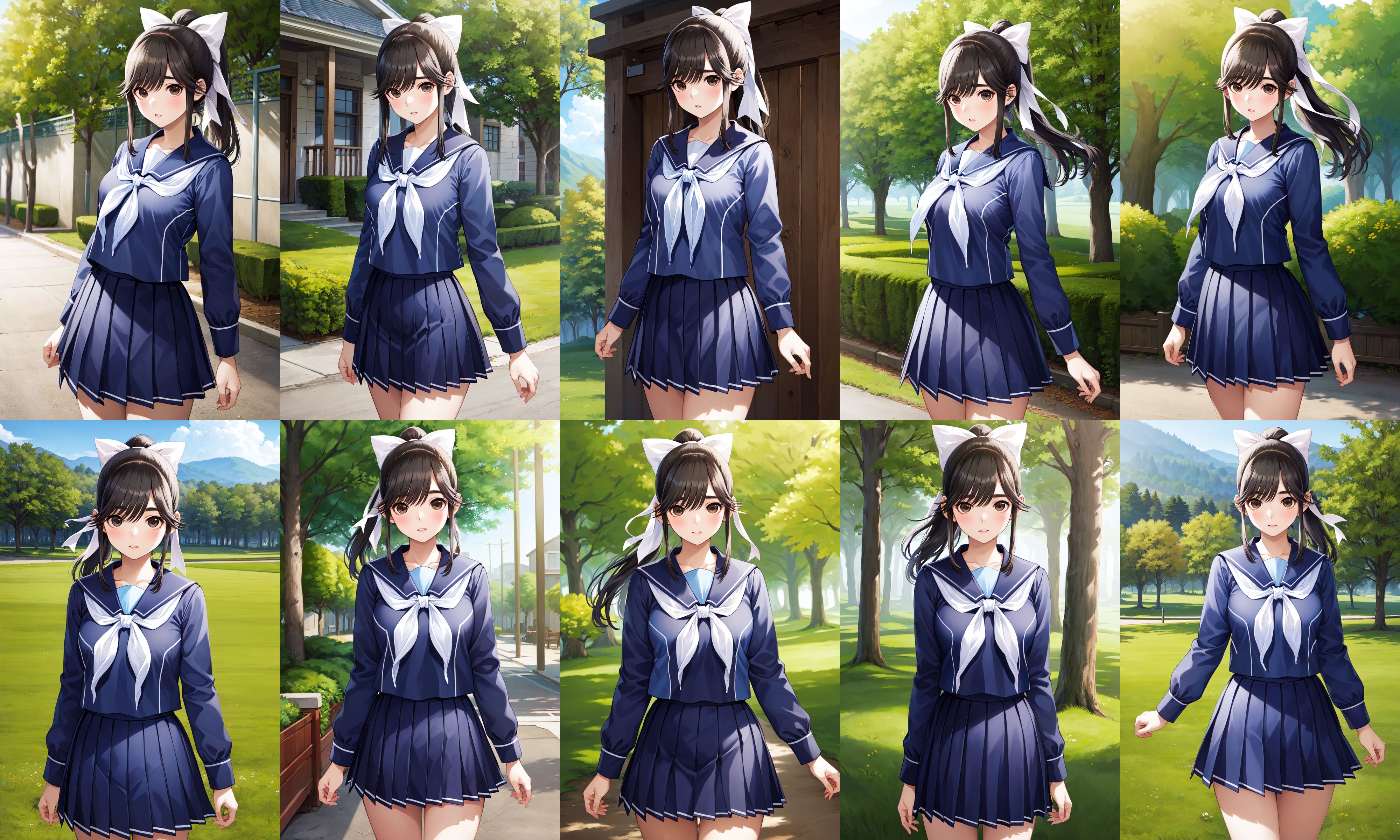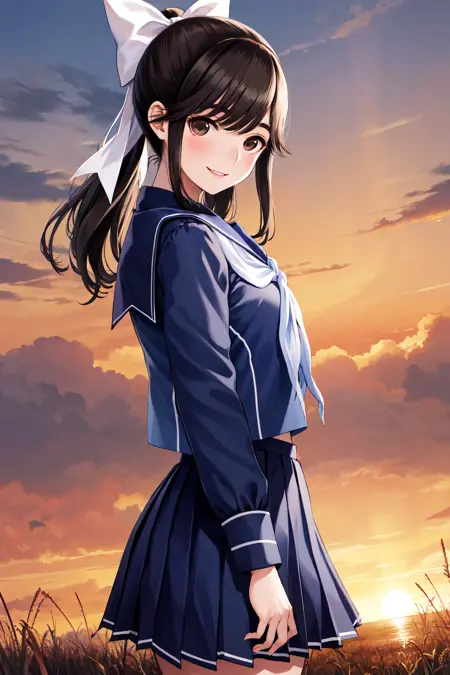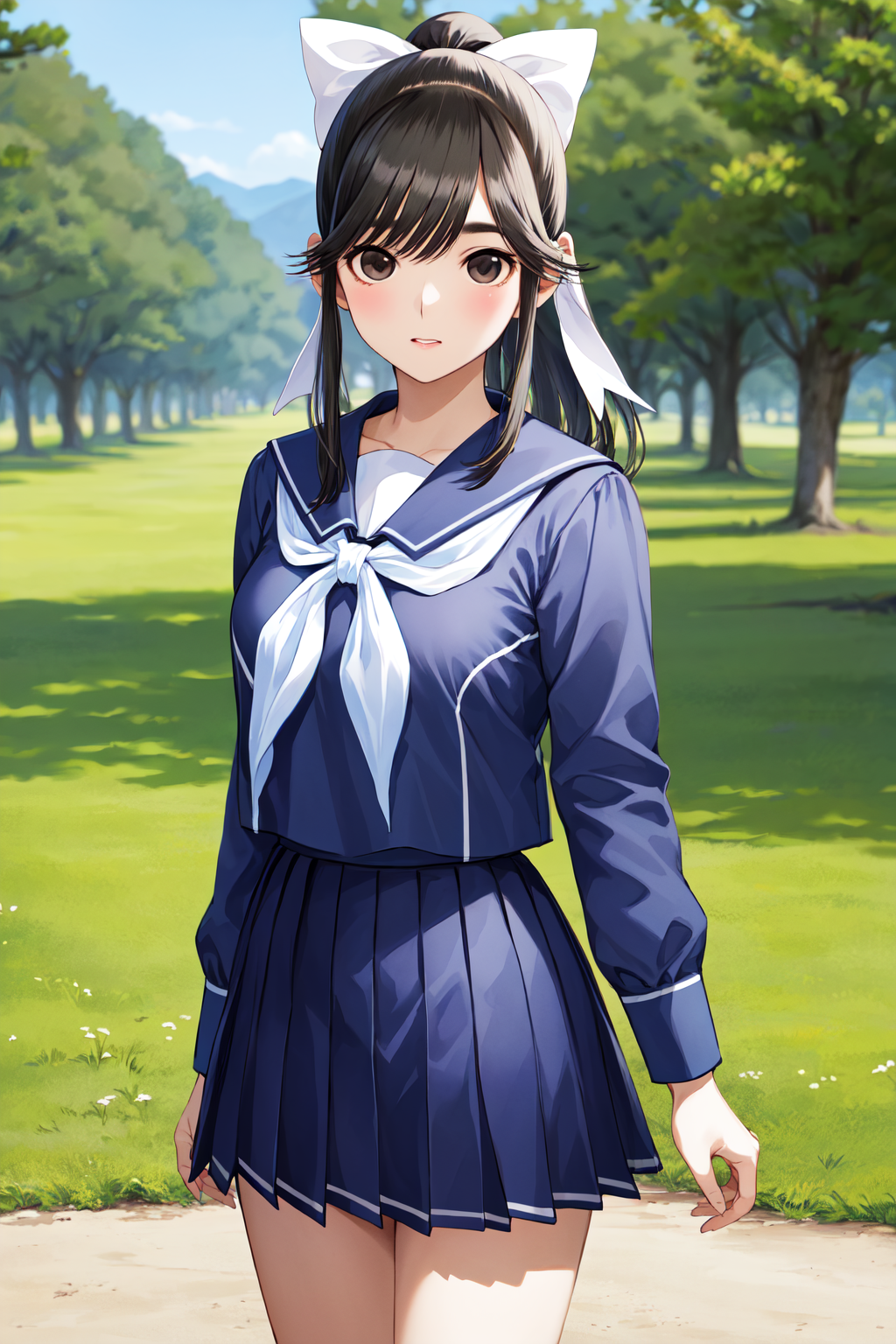 衣装1aamanaka, long hair, ponytail, hair bow, serafuku, white shirt, short sleeves, sailor collar, blue neckerchief, pleated skirt, blue skirt