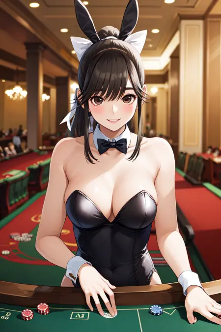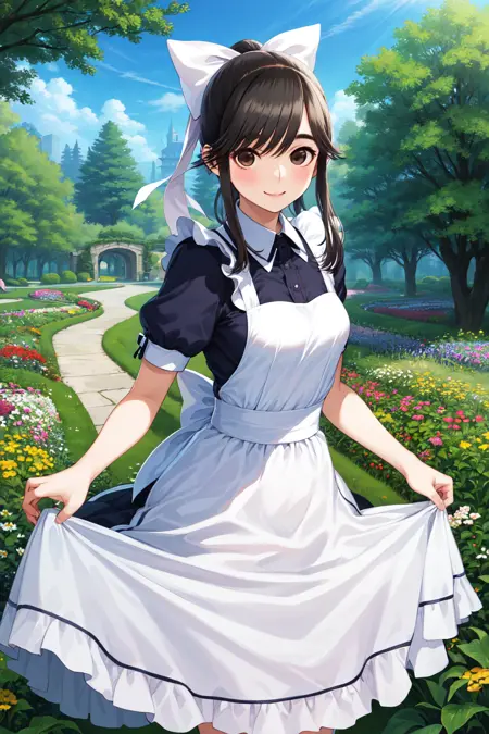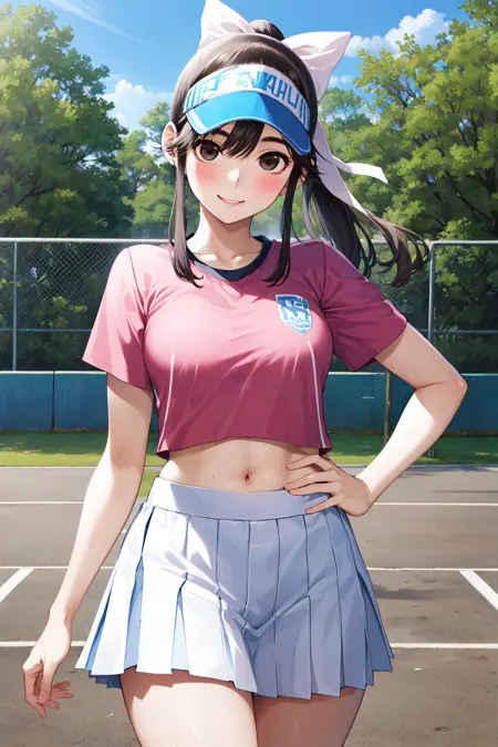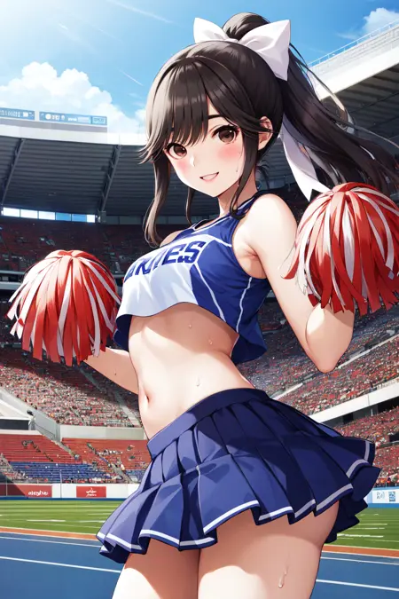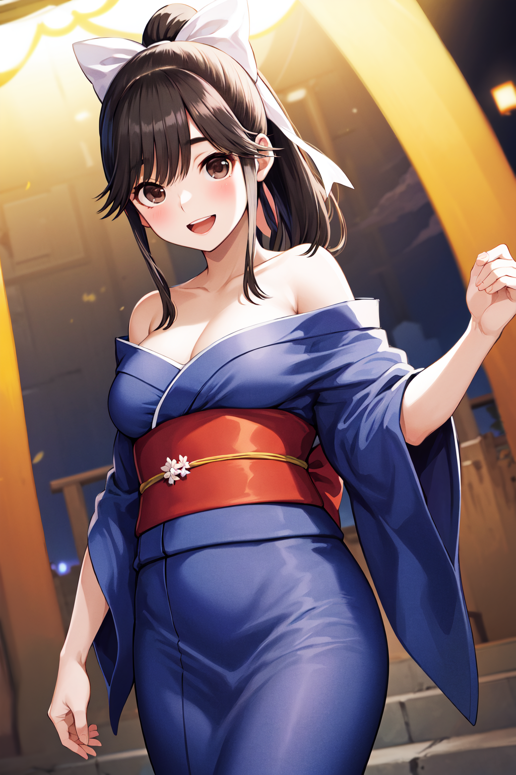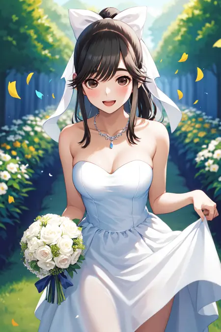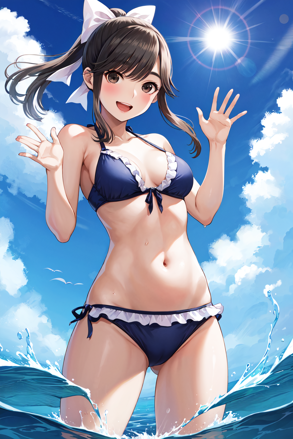 衣装1aamanaka, long hair, ponytail, hair bow, serafuku, white shirt, short sleeves, sailor collar, blue neckerchief, pleated skirt, blue skirt