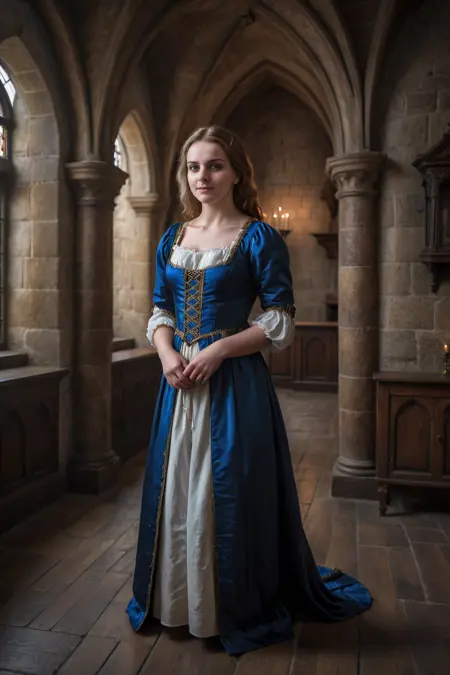 このモデルは、城の設定で女性の姿を描いています。中世の上流階級の生活の雰囲気を捉えています。