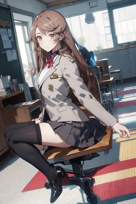 KotonoKashi, light_brown_hair, long_hair, school_uniform, grey_blazer, skirt, medium_breasts, thighhighs, brown eyes