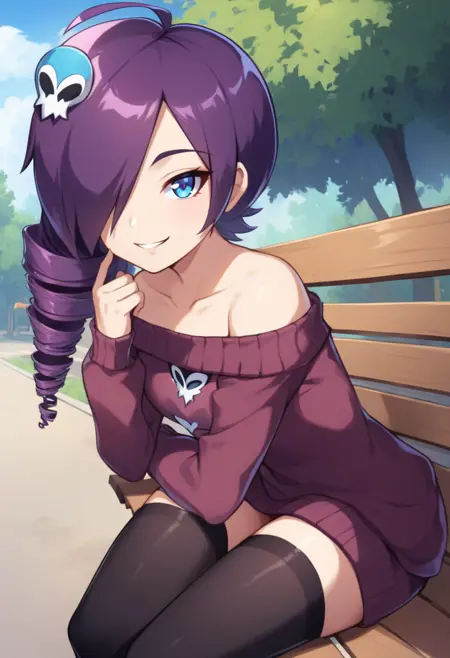 Trigger + Appearance: zone-tan, hair over one eye, ahoge, drill hair, skull hair ornament