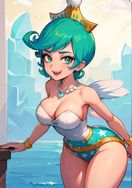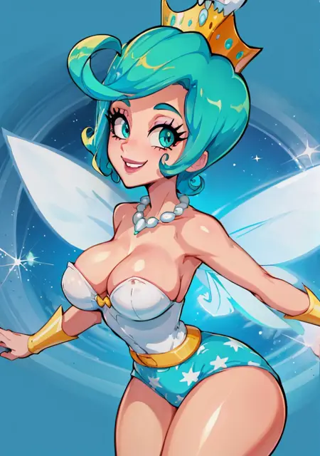 Main Words: "aqua hair, aqua eyes, short hair, crown, fairy wings, white leotard, gold belt, aqua high-waist panties, star (symbol), makeup, pearl necklace, high boots"