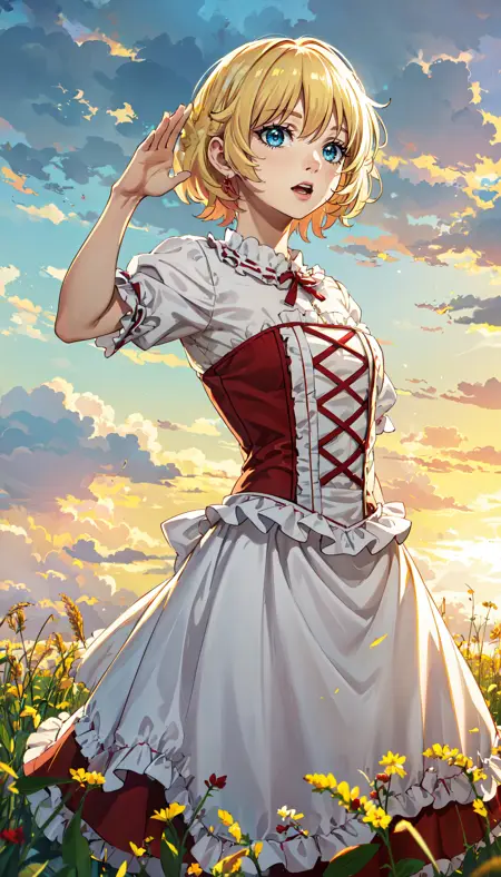 短发,金发,蓝眼睛,白衬衫,红裙子,长裙,红色束腰,围裙