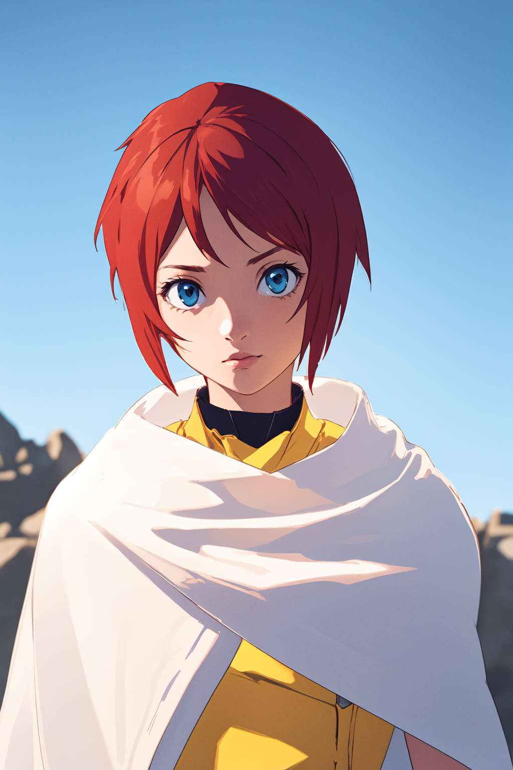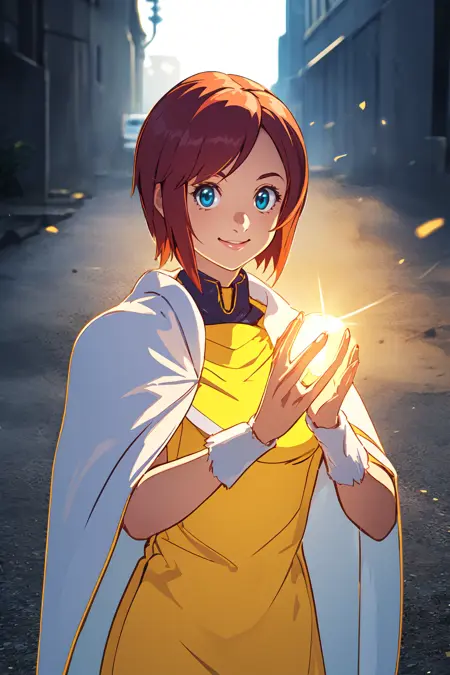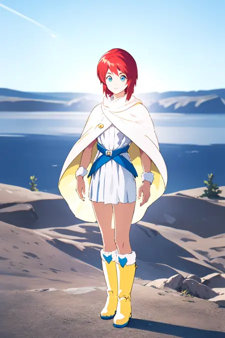 To get her iconic looks in game, add "cape, yellow one-piece, blue belt, white boots" to the prompt. Note her eyes can be a bit skewed when you draw her in full body, as the training materials for her full body images are all hand drawn. You can also do "cape, yellow one-piece" if you just want an upper body image.