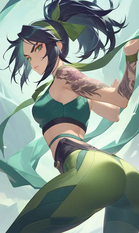 Akali (game): green ribbon, arm tattoo, green hairband, back tattoo, outfit default game, league of legends, green hairband, back tattoo