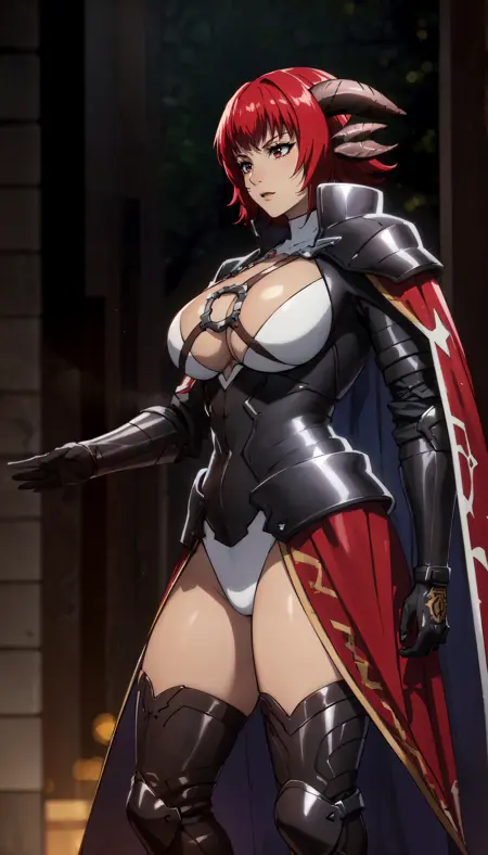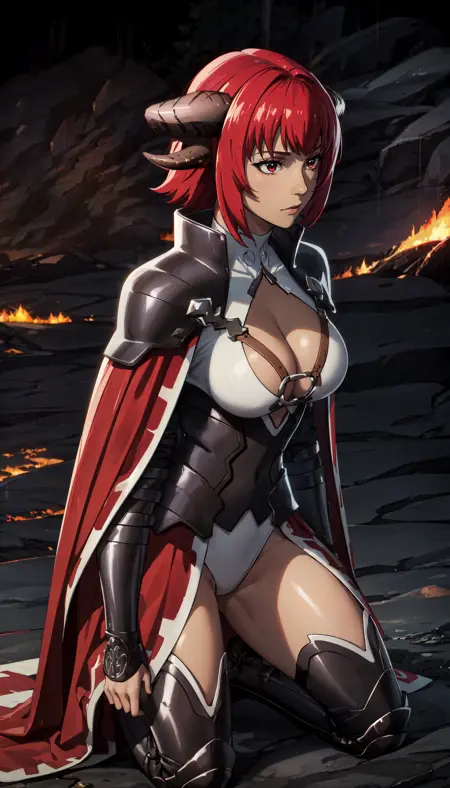 goat horns, red hair, short hair, red eyes, armor, white outfit, cleavage cutout, leather straps, shoulder pads, red cape