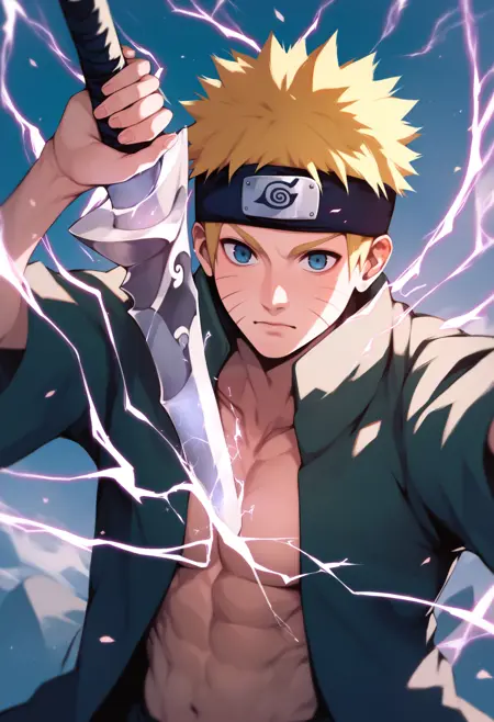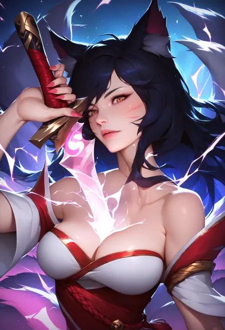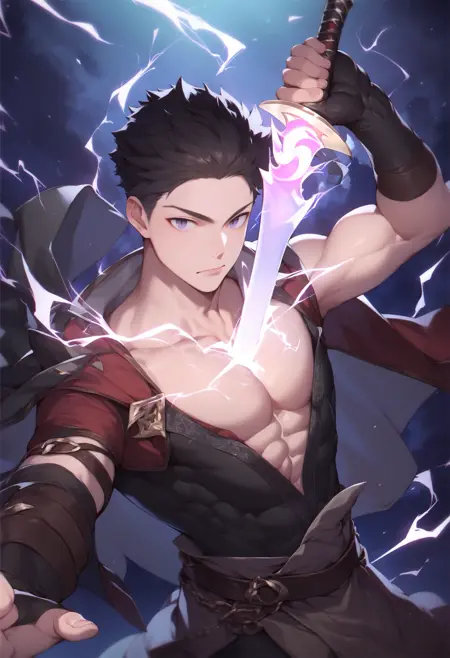 holding, holding weapon, holding sword, electricity, cleavage