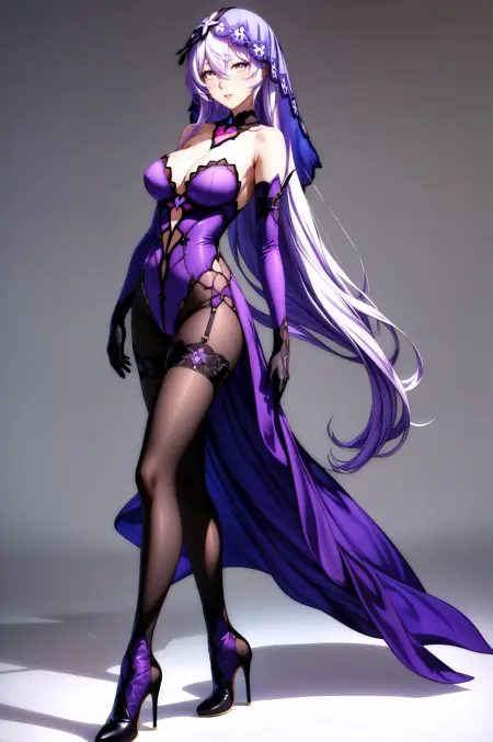 black swan, yellow eyes, purple hair, long hair, bangs, hair between eyes, large breasts, gloves, dress, cleavage, bare shoulders, boots, black gloves, elbow gloves, black footwear, high heels, veil, purple dress, tights,