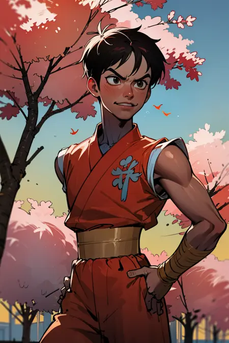 その他: オレンジの道着、オレンジのギ、空手着、フィッシュネットトップ、ハンドラップ、ベルト、オレンジのパンツ、スニーカー