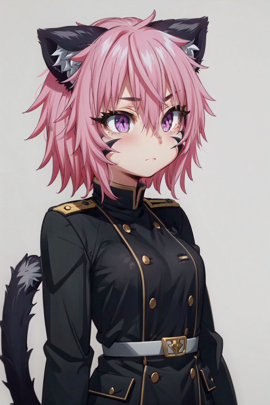 Prompts are : Nia, 1girl, pink hair, short hair, messy hair, cat ears, cat tail, purple eyes, facial mark, large breasts