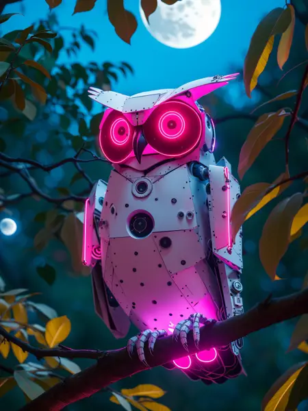 比如:master piece, high quality, a robot owl,neon lights, in a tree, at night, moon, j_sci-fi