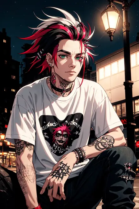(masterpiece, best illustration, extreme light and shadow), 1boy, solo, (male focus:.7), transgender male, red hair, white hair, green eyes, two tone hair, jacket, green jacket, gloves, green eyes, white hair, headband, bodysuit, yellow gloves, yellow bodysuit, multicolored hair, black headband, looking up, multicolored clothes, hair behind ear, long hair, green bodysuit, looking at viewer, open jacket, yellow jacket, arm up, multicolored bodysuit, goth eye liner, wristband, emo punk style, (punk:1.5), jewelry, depth of field, tattoos, minneapolis, (superhero:.4), (rogue of the x-men:1.2), wind swept hair, (seductive), (sidelighting), (volumetric lighting)