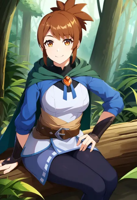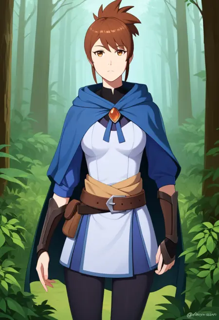 Default Outfit: jacket, brooch, cape, vambraces, leggings, belt