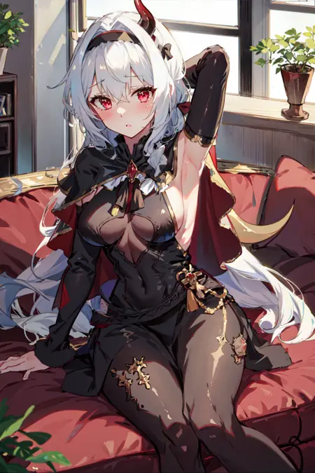 prisc, hair bow, hairband, dress, elbow sleeve, capelet, demon horn, pantyhose