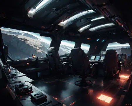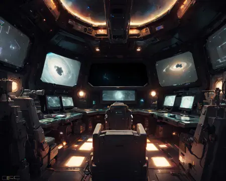 生成一座桥梁、一个CIC(战斗信息中心)或一艘穿梭机的驾驶舱,类似于动画游戏中的科幻场景。
