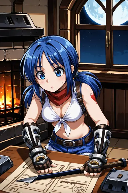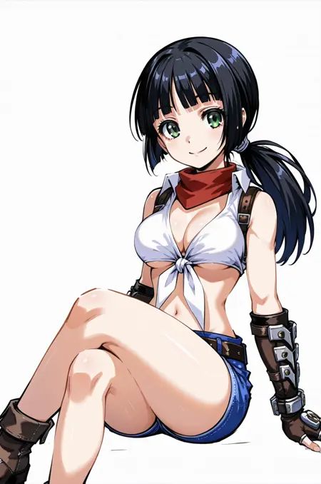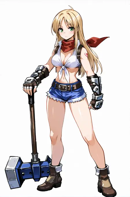 prompt: bsRO, red scarf, blue denim shorts, tied shirt, fingerless gloves, belt, under boobs