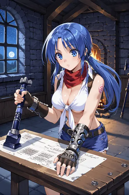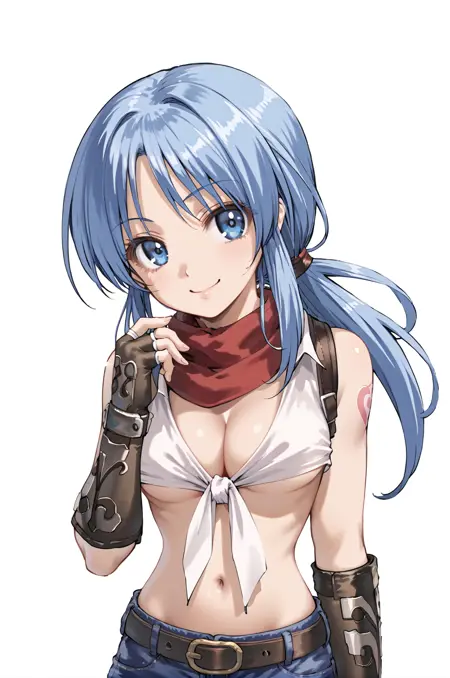 prompt: bsRO, red scarf, blue denim shorts, tied shirt, fingerless gloves, belt, under boobs