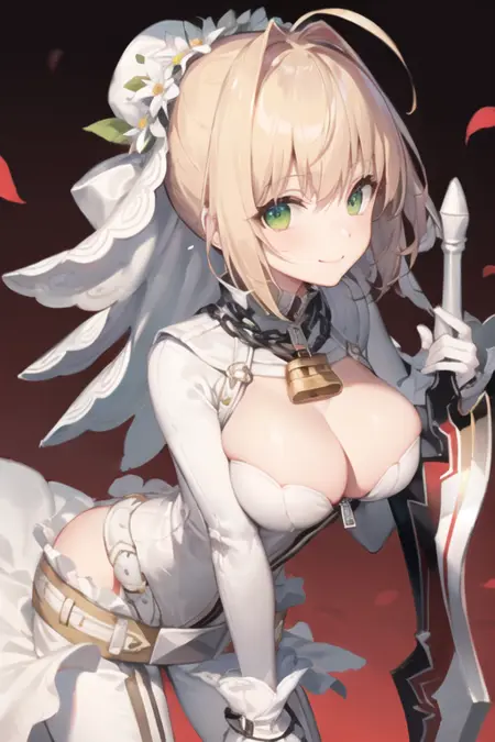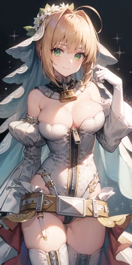 Recommended prompts: ahoge, blonde hair, head wreath, bridal veil, lock, green eyes, chain, elbow gloves, zipper, belt, hair intakes, bangs, hair between eyes, loose belt, center opening, cleavage, white bodysuit, puffy detached sleeves, leotard, zipper pull tab, single hair bun, white footwear, hair ornament, sidelocks**,** petals, white leotard, collarbone, strapless