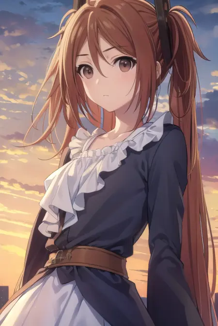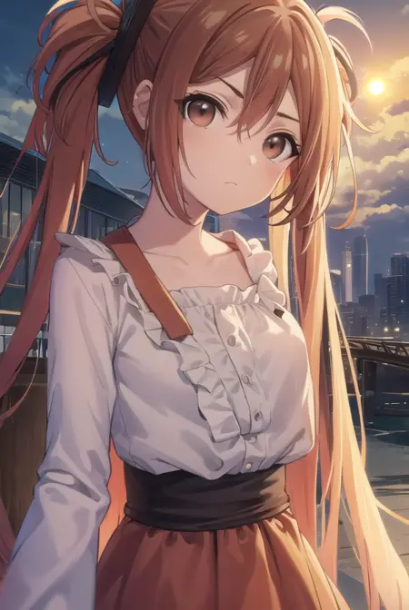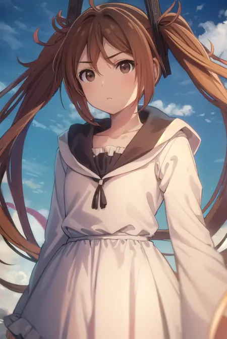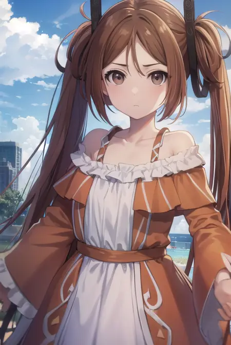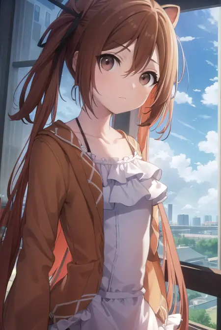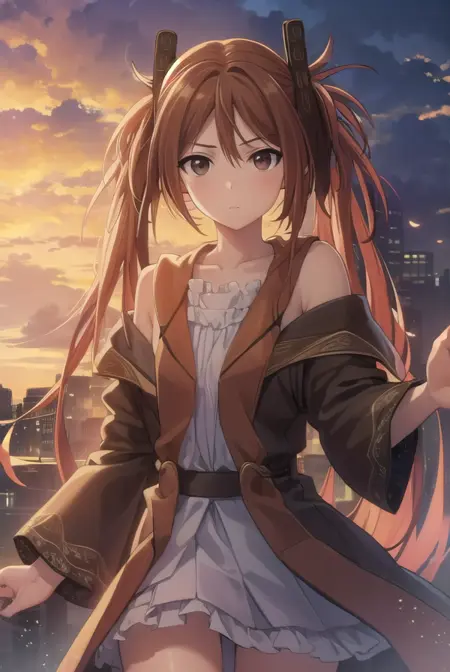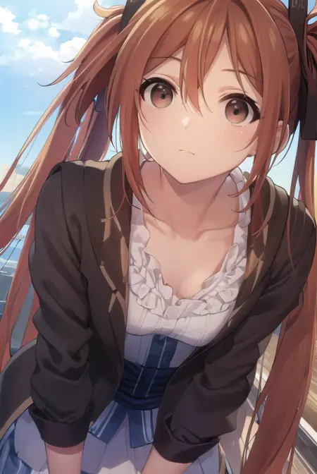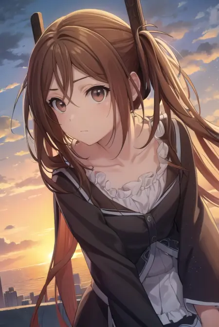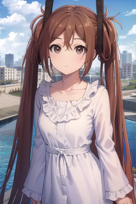 enju aihara, long hair, brown hair, hair ornament, twintails, (brown eyes:1.5),