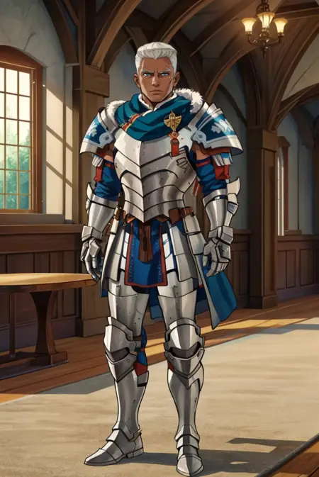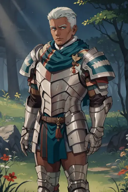 Timeskip appearance: warDedue, short hair, dark skin, cape, armor, gauntlets, scar on face, shoulder armor, scarf, fur trim