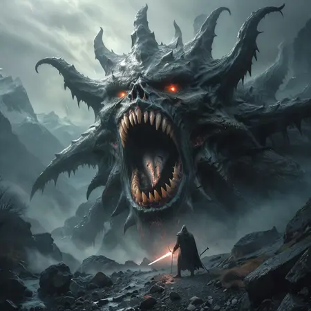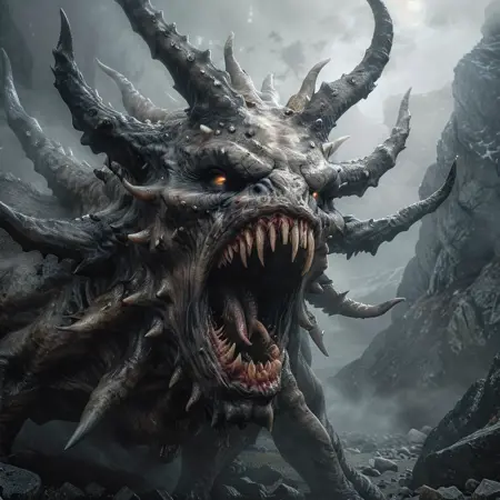 1other, cloud, cloudy sky, fangs, fendweir, glowing, glowing eyes, horns, no humans, open mouth, outdoors, rain, red eyes, rock, ruins, saliva, sharp teeth, size difference, sky, solo, spikes, standing, teeth, tree,