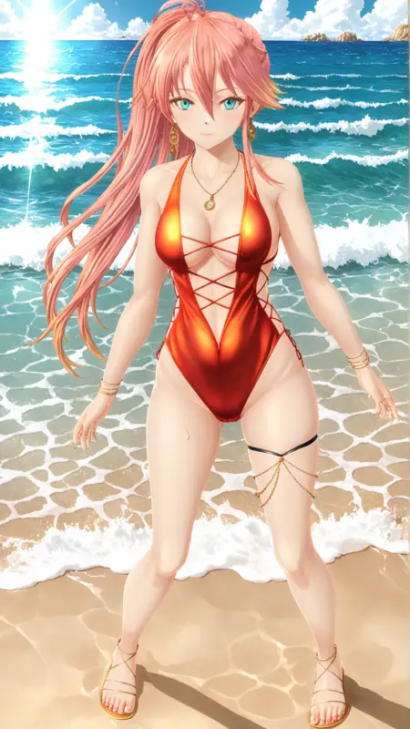 KnKJudithLanster wearing SwimsuitOutfit, coral-pink hair, orange hair tips, turquoise eyes, gold earrings, necklace, bracelet, thigh accessory, lace high heels,