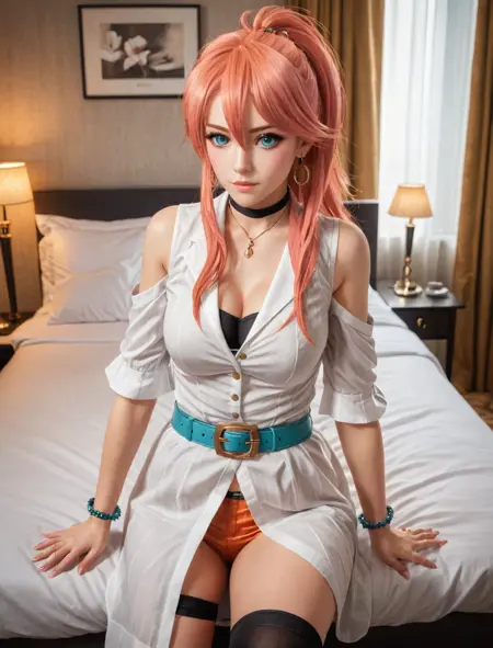 KnKJudithLanster wearing SignatureOutfit, coral-pink hair, orange hair tips, turquoise eyes, one earring, open dress with belt, detached sleeves, bracelet, coral-colored shorts, black thigh-highs, aqua high-heels,