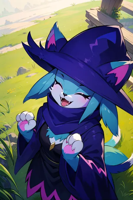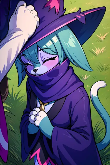 basic prompts: cat girl, furry, furry female, blue hair, blue skin, blue fur, colored skin, pink eyes, cat ears,